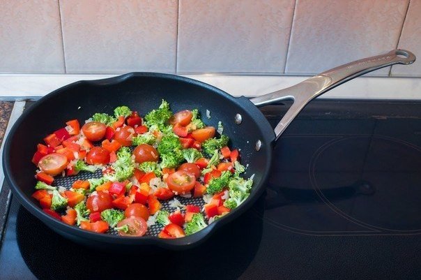 Режем помидоры черри пополам, брокколи разбираем на соцветия, а также режем болгарский перец. Добавляем овощи в сковороду и обжариваем пять минут
