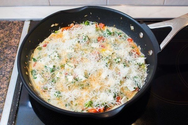 Когда фриттата схватится с краёв посыпаем тёртым сыром и отправляем в разогретую до 180 ºС духовку на 15 минут.