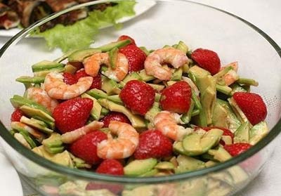 Добавляем клубнику, авокадо к креветкам. Добавляем сахар или сахарную пудру в салат, поливаем все оливковым маслом и хорошо перемешиваем. Данное сочетание продуктов может показаться весьма странным, но каждый ингридиент добавит свой неповторимый вкус салату. Не бойтесь эксперементировать. Салат также пожно полить соком лимона