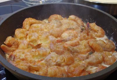 Креветки очищаем и обжариваем на сковороде примерно 5 минут. Ложим креветки в блюдо, излишки масла убираем.