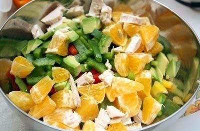 разрезаем пополам авокадо и убираем косточку. Авокадо режем кубиками. Очищаем апельсин и также режем кубиками, добавляем в миску с авокадо. Очищаем от семян сладкий перец, режем. Добавляем куриное филе