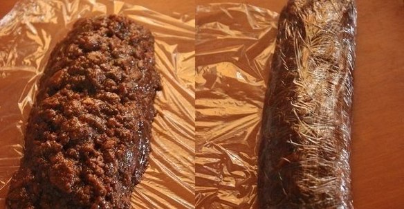 Выкладываем массу на пищевую пленку и заворачиваем в рулет. Увбиваем все в холодильник на 3-4 часа для застывания.