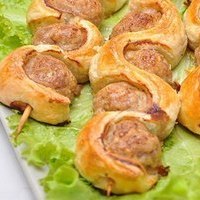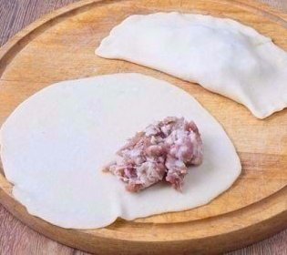 В фарш добавляем мелко порезанный лук. Для сочности его должно быть много, можно добавить холодную воду. Солим и перчим по вкусу. Тесто раскатываем в колбаски и режем на дольки по 2 см. Раскатываем лепешки и на край крадем тесто. Защипываем.