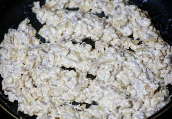 Берем шампиньоны побольше и отрезаем у них ножки. Ножки грибов измельчает и кидаем их жариться вместе с мясом. Жарим 5 минут помешивая. Смешиваем муку со сметаной. уменьшаем огонь и вливаем смесь в грибы. Тушим 5-10 минут на медленном огне, пока не загустеет смесь.