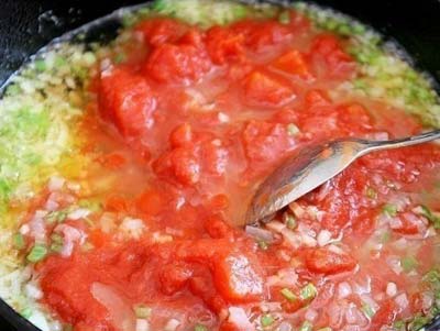Изготовим соус пока тушится куриный фарш. Режем лук, чеснок, вычищаем от зёрен перец чили и нарезаем, мелко режем помидоры. При отсутствии свежих помидор можно использовать консервированные. Тушим все ингридиенты на среднем огне в течение 5 минут. Добавить в соус немного сахара, черного перца и соль.