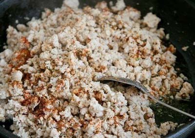 Перекручиваем куриное мясо и поджариваем его в течение 15-20 минут на растительном масле. В фарш добавляем орегано, кориандр, порошок чили или же красный молотый перец.