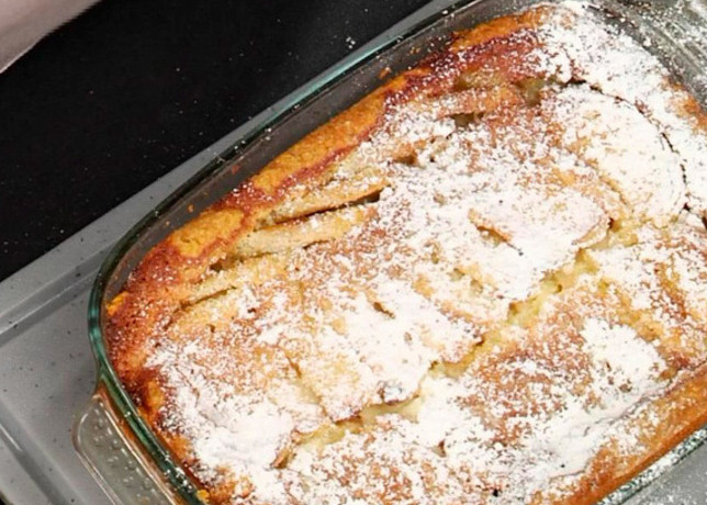 Заливаем кремом наш пирог и отправляем его в разогретую до 180 °C духовку на 40-50 минут. В конце посыпаем сахарной пудрой.