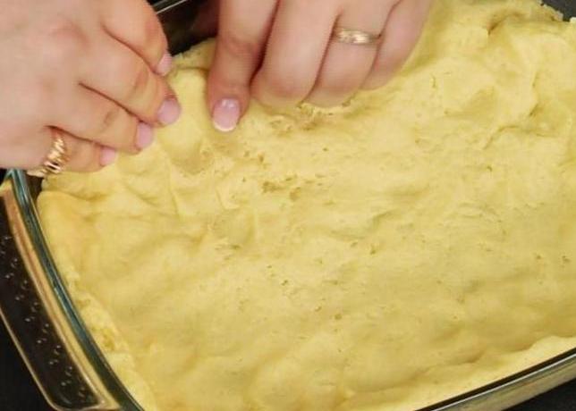 Растапливаем сливочное мало, добавляем туда 3 столовых ложки сметаны, перемешиваем и потихоньку добавляем муку и разрыхлитель. Тесто выкладываем в форму, предварительно смазанную маслом, тесто должно доходить до краёв.